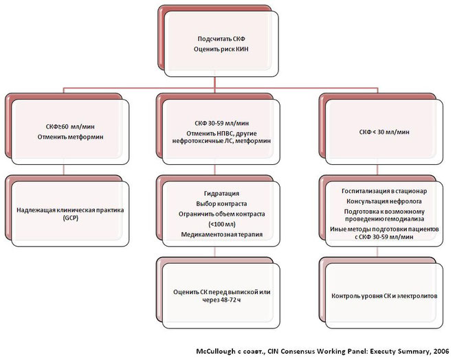 Наличие нескольких факторов риска развития КИН у одного пациента или лечебная тактика ведения, сопряженная с высоким риском, в совокупности могут давать очень высокий риск развития КИН (≈50%) и острой почечной недостаточности (≈ 15%), требующей проведения диализа после введения контрастного вещества
