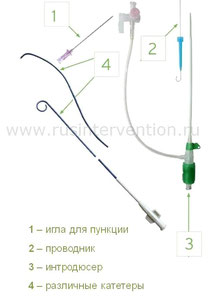 Далее удаляется пункционная игла, делается надрез кожи 2 мм и по проводнику в артерию (или вену, в зависимости от исследования) вводится специальное устройство (интродюсер), через которое в последующем будет проводиться катетер.