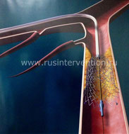Восстановление коронарного кровотокаЧрескожное коронарное вмешательство (ЧКВ) – заключается в проведение за место сужения в коронарной артерии специального интракоронарного проводника. Далее на проводник одевается специальный баллон, которым раздувают сужение сосуда и затем, предварительно убрав баллон, на проводник одевают стент (металлический каркас), который раскрывают в месте сужения. Данный метод восстановления коронарного кровотока проводится через маленький (около 2 мм) разрез кожи в области паховой складки или предплечья, что является малотравматичным и не требует реабилитационного периода. При проведении ЧКВ пациент находится в сознание. Наиболее хорошие результаты данного метода лечения наблюдаются в