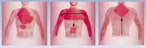 Боль часто «отдает» в межлопаточную область, левое плечо (реже правое плечо), левую руку, шею, челюсть (причем чаще в зубы с левой стороны); одним из редких проявлений стенокардии могут быть боль в эпигастральной области (что может сопровождаться тошнотой, рвотой, изжогой и даже коликами) или боль в области головы, что сильно затрудняет диагностику.