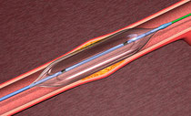 Далее по проводнику, как по рельсе, одевается баллонный катетер. Название устройства говорит само за себя. Баллонный катетер – это специальный инструмент, на конце которого находится баллон. Баллонный катетер хирург подводит к месту сужения коронарной артерии в сдутом состоянии и раздувает специальным шприцом с манометром (индефлятором) до определенного давления. При раздувании баллона атеросклеротическая бляшка, как бы вдавливается в стенку сосуда, тем самым увеличивая просвет артерии. Раздувание баллона проходит под рентгеноскопическим контролем.